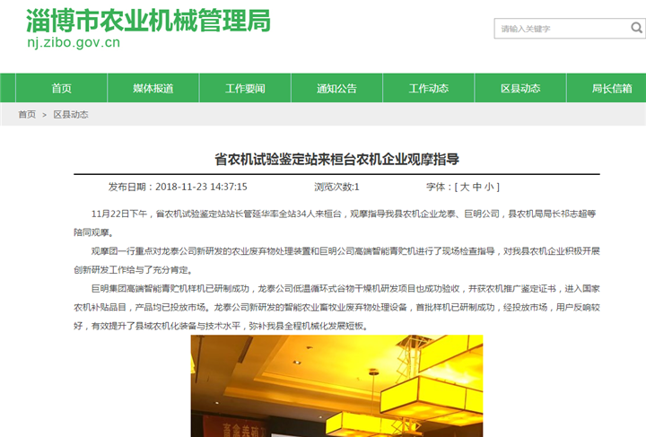 2018年11月22日山東省農機鑒定站、淄博市農業機械管理局來我公司山東龍泰機械考察,觀摩團一行對我公司新研發的有機廢氣物好氧發酵裝置進行了現場檢查指導,對我公司的工作給與了充分的肯定。